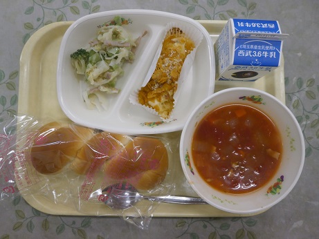 今日の献立 牛乳 ツイストパン チキンのフレーク焼き セサミサラダ ミネストローネ 今日の献立 牛乳 ご飯 ぶりの味噌マヨ焼き じゃがいものそぼろ煮 かき玉汁| 2025/10/24 |  |   | by:給食室 |