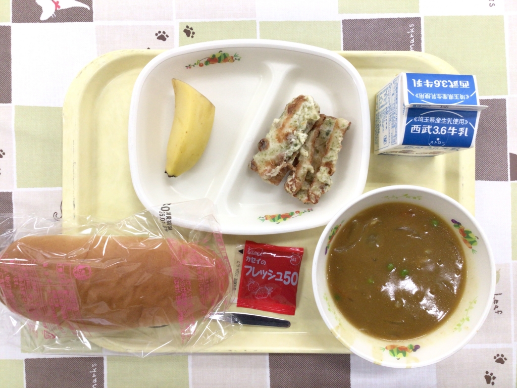今日の献立 牛乳 ご飯 大豆と蓮根のカリカリ揚げハムと大根のサラダ スピナッチカレー | 12345次 |