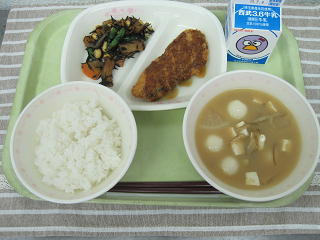 白飯 鮭フライ 大豆の磯煮 重忠汁 牛乳