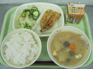 御飯、いわしのかば焼き、きゅうりとキャベツのドレッシング、スタミナスープ、コーヒー牛乳