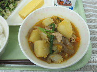 白飯 じゃが豚キムチ 厚焼き玉子 おかかあえ 牛乳