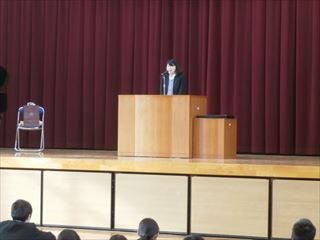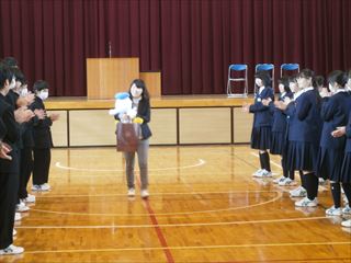 本日(24日)で、本校学校相談員の船越(あ)先生が、退職になります。そのお別れ会を終業式後に行いました。 生徒会長からのお礼の言葉と贈り物をお渡ししました。約2年間に渡り、豊里中生や保護者の方々の様々な相談に対応して頂きました。ありがとうございました。船越先生、お元気で! ◆船越先生のお別れの会から