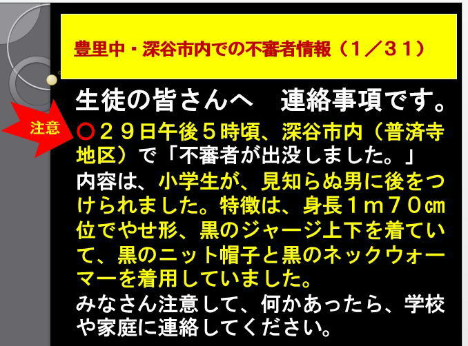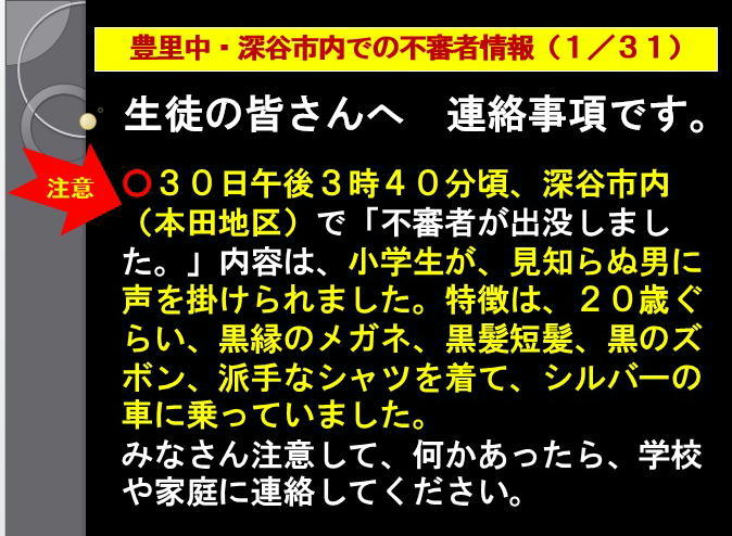 本日、市内で不審者の情報が、2件入りましたので、ご注意ください。