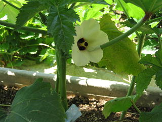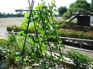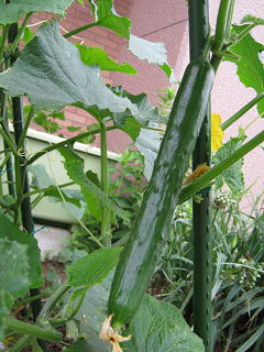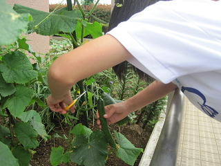 夏に育てていた作物の様子を少しずつ紹介していきます。これは、何の花でしょうか?正解は・・・・・・・・・「オクラ」でした~。ハイビスカスに似た、淡いクリーム色のきれいな花が咲くことに驚き、初めて知った生徒も多くいました。また、オクラの実り方(空に向かって実る)に、へぇ~と驚いている場面もありました。続いて、「きゅうり」です。つるや茎、葉、きゅうり表面のトゲが痛いので、気をつけて収穫しました。でも、「チクチク」は新鮮な証です♪★その2へ続きます・・・