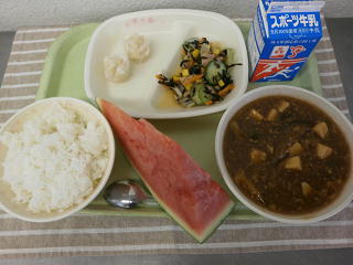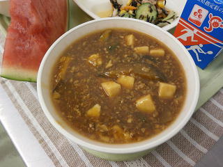 夏場の給食の定番、夏野菜のナスが入った麻婆豆腐です。