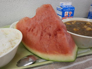 今年初物のスイカです。大きな大きなスイカを一人1/32カットに