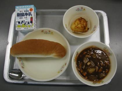 パンとカレーシチュー」です。給食が始まった頃のメニューになりますが、生徒のみ