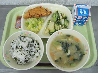 わかめ御飯、とり天(添えキャベツ)、ポテトのさっぱりサラダ、大根とあさりの味噌汁、牛乳