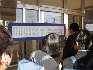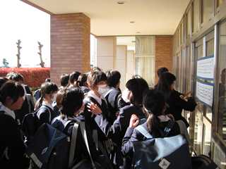 本日(8日)、朝の生徒玄関前で新3年・新2年生クラス発表を行いました。そして、続いて始業式を