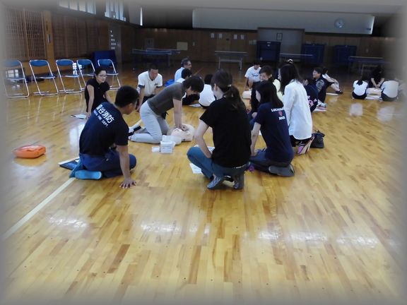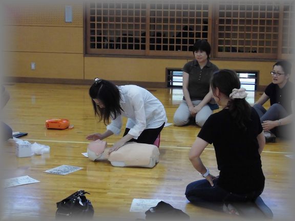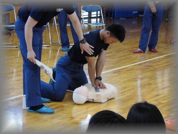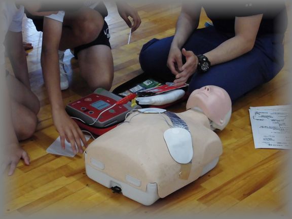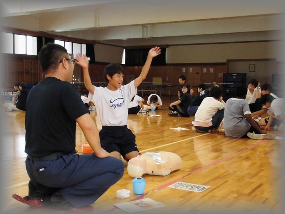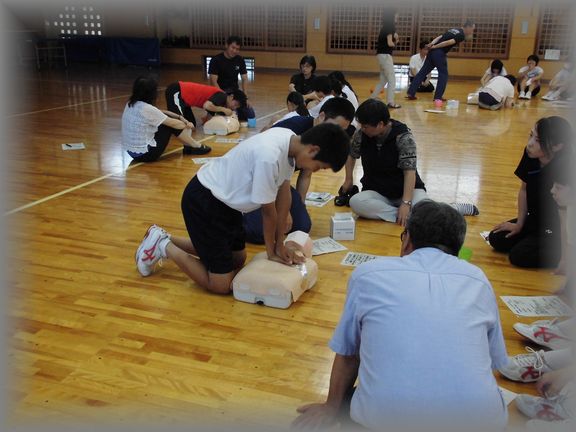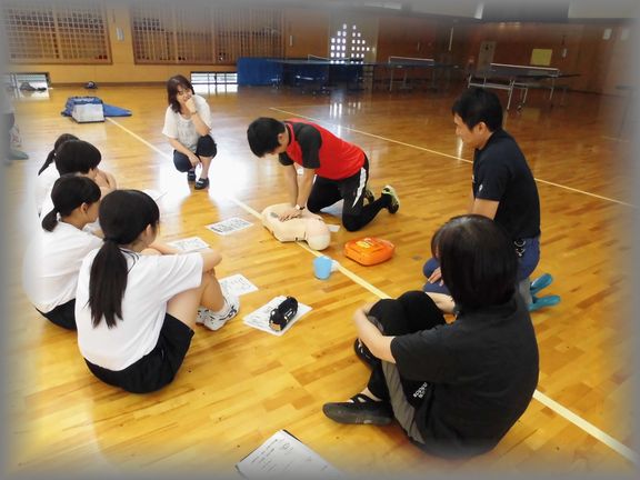 本日、放課後体育館1Fで深谷消防署豊里分署の方を講師として招き、応急手当講習会を実施しました。教職員のみでなく、各部からの代表生徒14人、PTA保健委員の方も参加し、心肺蘇生法やAEDの使い方について教えていただきました。