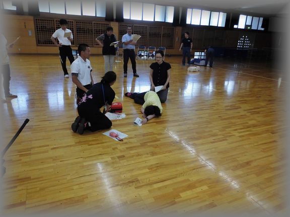 講習会終了後、教職員による「緊急時シミュレーション研修」を行い、休日の部活で緊急対応が起こった場合を想定して、それぞれの立場でどう行動するかをやってみました。