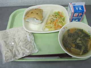 ねぎまうどん 黒糖パンケーキ和風サラダ 牛乳黒糖パンケーキは人気の献立のひとつです。プルーンや黒砂糖、赤ワインが入っています。今日は多めに作ることができたので、各クラスにオマケをつけました。全部完食でした♪