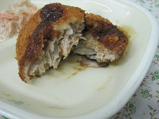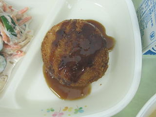 レンコンをスライスしてメンチカツにのせた「レンコン入りメンチカツ」です。