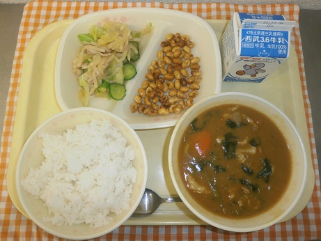 今日の給食は、小江戸カレーでした。小江戸カレーは、さつまいもが入った