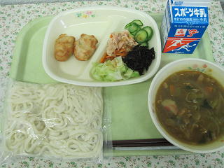 カレーうどん お魚ナゲット ツナとひじきのサラダ 牛乳