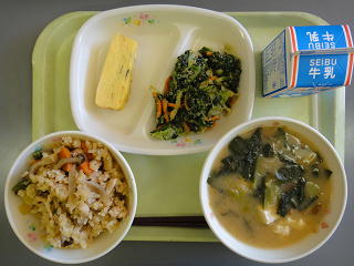 秋の香りご飯 なめこ汁 ひじき入り厚焼き卵深谷産ほうれん草のごま和え 牛乳本日の給食の「ほうれん草のごま和え」には、先日、「深谷市園芸協会」様よりいただいた深谷産のほうれん草を使っています。ほうれん草にはビタミンが多く含まれていますが、その中でも、体内でビタミンAとして働くベータカロチンを多く含みます。 目や美容、美肌によく、また風邪の予防にも効果的です。