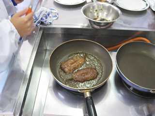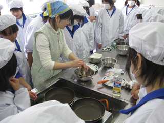 授業では、「いわし」を使っています。はらわたを取りって、開きにしたものをフライパンで焼きました。どの生徒も、魚をさばくことがほとんどないので、初めは戸惑っていましたが、慣れるにしたがって進んで取り組んでいました。最後は、かば焼きの大変良い香りが、教室に広がっていました。美味しい料理ができて、生徒も満足していました。