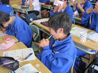 13日(水)の5校時、6校時で1年生の各クラスでカラーテスターを使用しての歯の保健指導を実施しました。