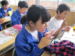 80歳で20本以上の健康な歯を残そう!!8020運動」と題して歯周病の予防についてや、正しい歯みがきの仕方について学習しました。実際にカラーテスターを使って、普段の歯みがきでの磨き残しはどんなところか?確認することができました。今日学んだことを忘れずに、日々の歯みがきをしっかりしてむし歯や歯周病を予防していきましょう。2,3年生も1学期中に実施する予定です。