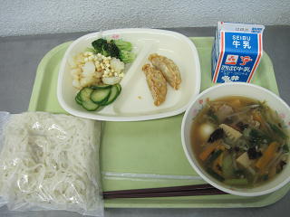 広東麺 揚げ餃子 ポテトのさっぱりサラダ 牛乳