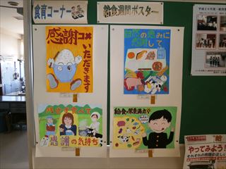 廊下等の掲示はもとより、給食室への廊下には、学校栄養士さんや給食委員