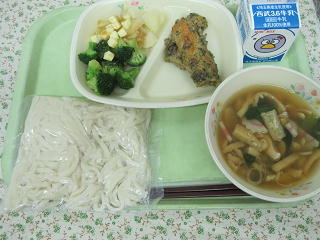 五目うどん 竹輪の磯辺揚げ ポテトのサッパリ揚げ 牛乳