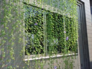 尚、昨年行われた、埼玉県吉見浄水場での節電対策として壁面緑化の取組が琉球朝顔を使用されていたので一部写真を掲載します。豊中のみなさん、「緑のカーテン」の維持・管理をお願いします。