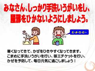 時期になりました。学校でも「かぜ予防」に関する指導を行っていますが、ご家庭でも、予防についてご理解・ご協力をお願いいたします。特に、3年生は今後、受検(受験)がありますので体力つけておいてください。次の画像は、学校でインフォメーションに流しているものです。ご覧ください。
