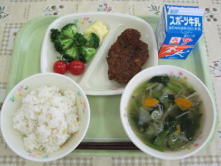 勝つ(カツ)丼、ちゃんこスープ、温野菜、牛乳