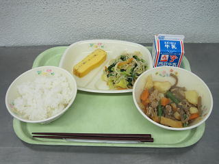 白飯 肉じゃが ひじき入り厚焼き卵からしあえ 牛乳肉じゃがといえば、じゃがいもがたくさん入っていますね。じゃがいもにはビタミンCが多く含まれているので、風邪予防や美容に効果が期待できます。しかも、熱に弱いビタミンCですが、じゃがいものビタミンCはデンプンに守られているため、熱を加えても壊れにくいのがポイントです。また、余分なナトリウムを排出するためのカリウムも豊富に含まれています。