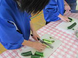 前回紹介したロングきゅうりよりも、さらに大きく長いきゅうりが収穫されました!金曜日には10cmに満たない小さなきゅうりでしたが、土日の2日間で、あっという間に成長してしまったようです!!びっくり!!4組さんが浅漬けをつくってくれました。味付けは3種類♪「ピリ辛」「ごま」「青シソ」です。唐辛子は、昨年つくった一味唐辛子です。おいしくいただきました~ごちそうさまでした!