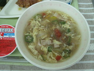 <旬の夏スープ> <セレクトデザート>旬の夏スープには、オクラ、トマト、黄ピーマンが入っています。