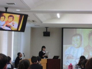 *大勢の前でしっかりと英語でスピーチする竹内さん。ALTのメアリ-先生も出席されました。