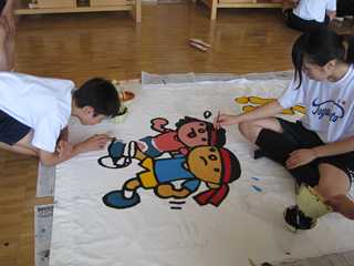 部員全員で協力して、とても素晴らしい昇り旗が、できあがりました。体育祭当日、テニスコートの防球ネットに掲げられます。