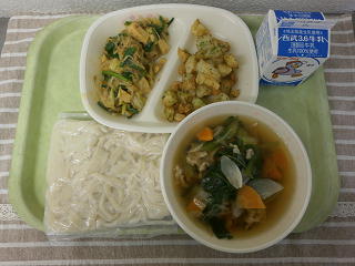 肉うどん 春雨のピリ辛炒め 青のりポテトビーンズ 牛乳