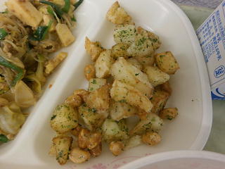 角切りにしたじゃがいもと、大豆をカリカリに揚げて、塩、こしょう、青のりで
