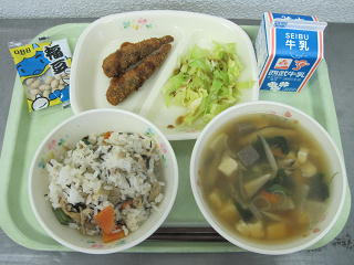 かてめし、イワシフライ、添えキャベツ、けんちん汁、福豆、牛乳節分は本来、季節の変わり目である「立春・立夏・立秋・立冬」の前日を言いますが、立春が1年の初めと考えられることから、次第に春の節分を指すようになりました。