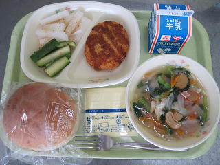 コロッケバーガー、スープスパゲティ、スティック野菜、牛乳