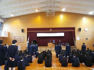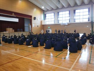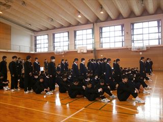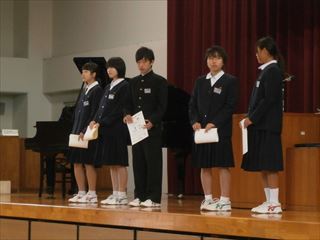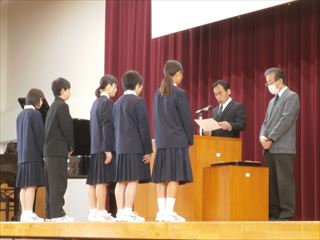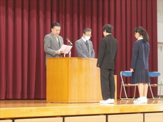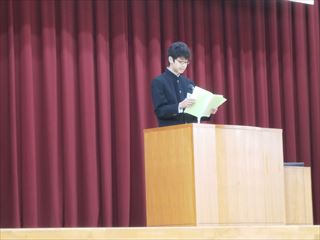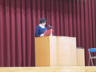本日(26日)、平成25年度の修了式を行いました。式では、まず学年代表として、1年生の鵜殿さんと2年生の野澤さんからこの一年を振り返ってと来年度に向けての力強い意見発表がありました。そして、各学年代表の1年・浅見さん、2年丸山さんに、校長先生から修了証が渡されました。在校生のみなさん、よく頑張りましたね。続いて、校長先生のお話では、創立50周年というこの1年を振り返って、1・2年生がよく頑張ってくれて豊里中学校を支えてくれたことへのお礼がありました。また、小学校6年生が、4月に入学するので先輩として、迎えてもらいたいとのお話がありました。 次に、「どんな逆境でも、人は力を発揮できる。」ということから、女子レスリングの吉田選手の中学時代に骨折しても全国大会に出て優勝したこと、そして、先日のワールドカップで日本が優勝したことと父親の栄勝さんの死を乗り越えた姿について、お話されました。 最後に、「経師は遭い易く、人師は遭い難し」という中国のことわざから、これから多くの人と会い、自らを指導してくれる人を捜してもらいたい。ということを話されました。 式に先立って、表彰がありました。深谷市バドミントン大会・さくらCUPと正智杯中学校バレーボール大会、そして、校内タイムトライアル表彰について行いました。本当によく頑張ってくれました。おめでとうございます。