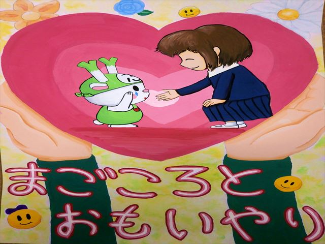 福島さんの絵には、涙を流しているふっかちゃんを優しく慰めている女子中学生が描かれていて、とても素晴らしいですね。豊里中のみなさん、福島さんのポスターに書かれている「まごころとおもいやり」をみんなで実践しましょう。 金賞作品
