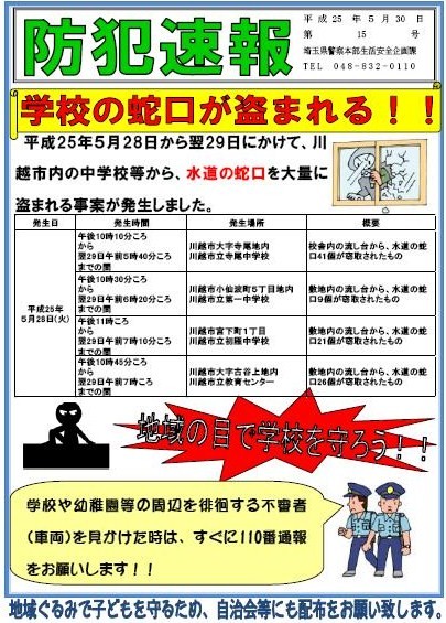 ◆埼玉県警からの「防犯速報・第15号」~学校等から水道の蛇口盗難~