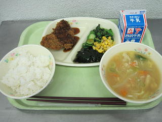 ご飯 磯辺チキンカツ 小松菜サラダ春キャベツのみそ汁 牛乳今日のチキンカツには衣にひじきとあおのりが混ざってあります。磯の香りがしますが、気がついた人はいたでしょうか?ひじきやあおのりには鉄分が多く含まれるので、色々な料理に混ぜて食べてみてくださいね。