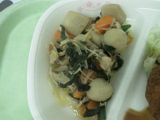 16日(金)の給食 新メニュー 里芋と鶏肉のバターしょうゆ煮