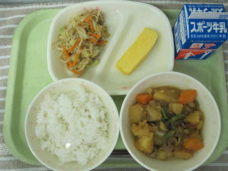 ご飯 肉じゃが 厚焼き卵 おかかあえ 牛乳