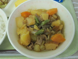 今日は和食の定番、肉じゃがです。じゃがいもが煮崩れ