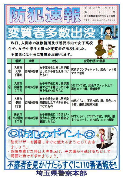 今回は、「変質者多数出没」に関するものです。特に、入間市・所沢市内での事件が