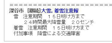 ◆熊谷気象台より、大雪・着雪注意報が発令されています。