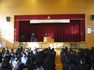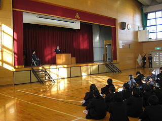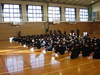 今回の全校朝会は、八基駐在所佐々木様、豊里駐在所熊野様二人の警察官の来ていただき、非行防止について講話をいただきました。非行の防止は、「ことわる勇気」が大切です。と何度も繰り返しお話ししていました。これからも・安心・安全・優しい豊里中が続くようお願いします。