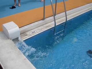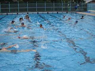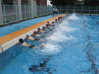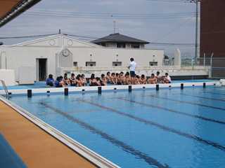 水泳指導は、健康観察が大切です。教師の指示とともに、生徒もプールに入り泳いでいてま。 プールを維持管理しています。