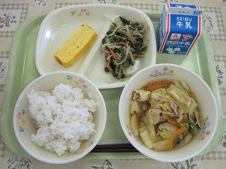 白飯、すきやき風煮、厚焼き玉子、ごまあえ、牛乳